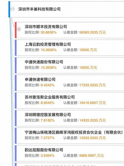 記者在企業(yè)工商信息查詢得知,目前豐巢科技最新的股權結構為,深圳市順豐投資有限公司為大股東,持股30.8636%,韻達系(上海云韻投資+韻達控股)為第二股東,持股共14%,中通持股10.3636%,申通持股9.4545%。