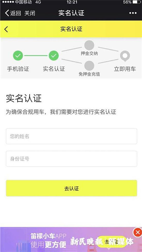 這輛黃色小車車身上貼有二維碼,并寫著“掃碼一元用車”,右側(cè)后輪安裝有四位密碼鎖。小新嘗試掃碼,跟共享單車注冊流程相似,需要手機(jī)注冊和實名認(rèn)證。實名認(rèn)證后,則可選擇是否交納押金,按提示說明,兩者在后續(xù)使用費用上存在差異,交納99元押金后的使用價格便宜一些,半小時1元。