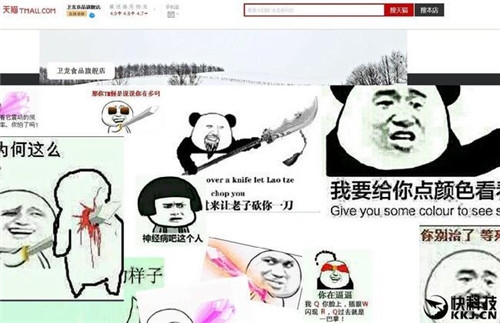 當天下午一點半,我們更換了一個與暴漫相關的頁面,仍是粗制濫造的被黑畫風。因為下午一點的時候,店鋪已經(jīng)到了流量峰值,觸達全網(wǎng)用戶后,為了保持話題持續(xù)關注度,我們臨時增加了與黑客博弈的環(huán)節(jié),這時傳播的渠道已經(jīng)不是阿里系內(nèi),而是微博。為了迎合微博用戶的喜好,制造第二次被黑使用暴漫表情包元素,并埋下與暴漫合作伏筆。