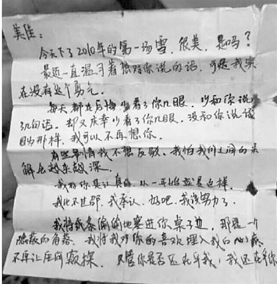 昨天網(wǎng)友“來呀來呀快來打我呀”發(fā)了一條微博,說的是他的學(xué)妹于無意間在教室桌子的縫隙里,發(fā)現(xiàn)了一封情書——情書是一個男生在2010年寫給一個叫“美佳”的人。