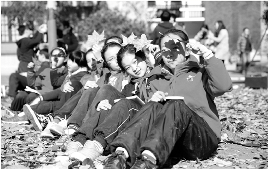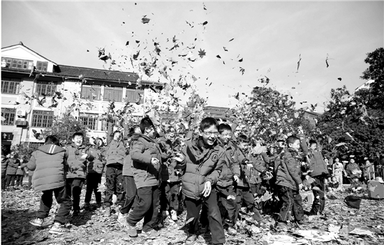 中午,當錢報記者趕到學校時,被眼前的景象驚到了:150米的環(huán)形操場中間,鋪滿了金黃色的落葉,一群學生正把落葉滿滿地捧起,再高高地往上一拋,于是只見滿眼的落葉紛飛……