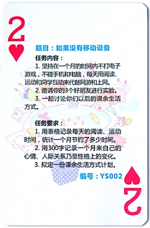 趙伊湄抽到了“紅桃2”。作業(yè)題目是:如果沒有移動設備,同時給出了三項任務,要求在一個月內不打電子游戲,不碰手機和電腦,每天用閱讀、運動和同學互動代替網游和上網。