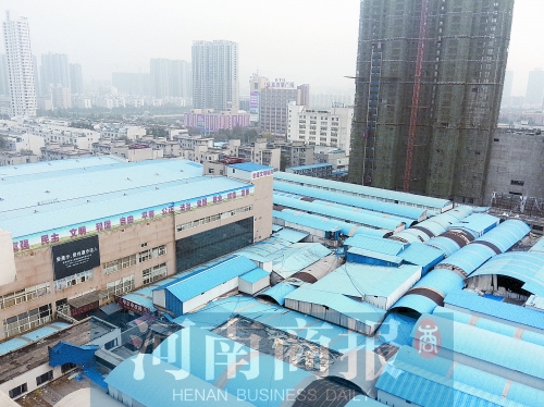 從現代童鞋城的窗戶向外看,盛祥置業(yè)的樓頂是一片藍色頂棚