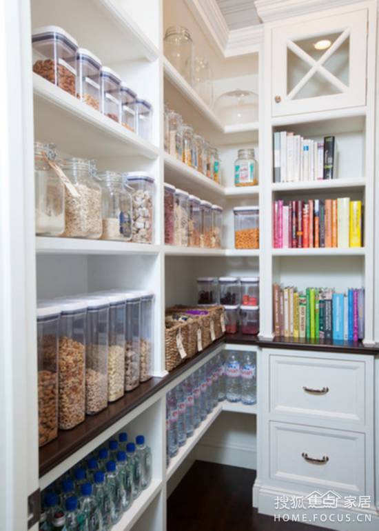 對(duì)于一個(gè)廚房,儲(chǔ)藏室面積是非常寶貴的,這里的貨架是原料的完美收納空間。瓶瓶罐罐全部擺放整齊,保持區(qū)域整潔,增加了廚房的樂趣。
