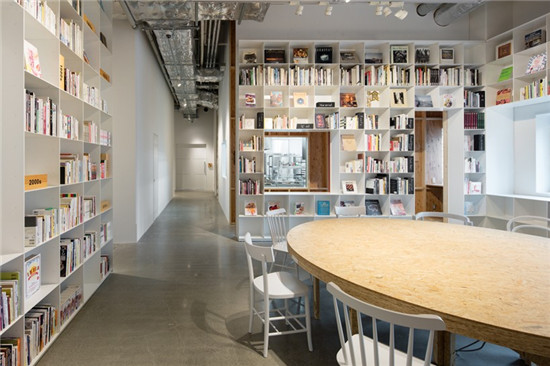 schemata第一次整修的時(shí)候包括有攝影工作室、廚房和餐廳。最近整修包括大型開放式的空白庫(kù)??恐鴫Ρ诘陌咨墓褡永镅b滿了書,透過這個(gè)小櫥窗可以看到廚房里面的情景。