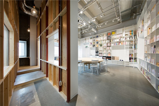 這個(gè)建筑工作室通過創(chuàng)建一個(gè)既包括圖書館,另外還有一個(gè)蛋糕店的空間來完成人們輕松聚集在一起這個(gè)愿望??此坪敛幌嚓P(guān)的兩個(gè)空間,只要提供了一個(gè)聚集區(qū),就形成了一個(gè)互動(dòng),兩者就聯(lián)系在了一起。