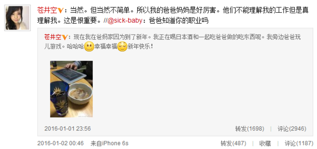 隨后有網(wǎng)友留言,問(wèn)及“你爸爸知道你職業(yè)嗎?”蒼井空很是坦誠(chéng)回答:“當(dāng)然。但當(dāng)然不簡(jiǎn)單。所以我的爸爸媽媽是好厲害。他們不能理解我的工作但是真理解我。這是很重要?!备芯W(wǎng)友敏感地問(wèn)道:“蒼老師的父親也看過(guò)她的作品嗎?”蒼井空反問(wèn)“如果你爸爸的話怎么樣”讓網(wǎng)友為其機(jī)智點(diǎn)贊。