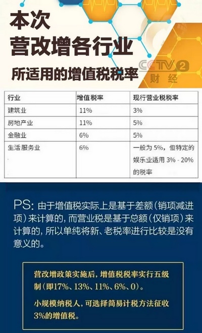 5月1日“營(yíng)改增”全面推開,建筑業(yè)、房地產(chǎn)業(yè)、金融業(yè)、生活服務(wù)業(yè)將告別營(yíng)業(yè)稅。這項(xiàng)看起來“高大上”的改革,涉及近千萬(wàn)戶新納稅人、全年減稅超5000億元。營(yíng)業(yè)稅退出歷史,你我能獲多大好處?