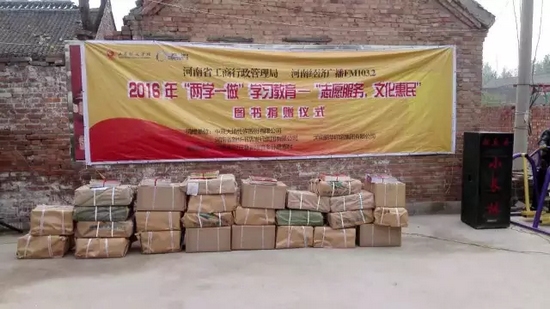 今天,河南省工商局聯(lián)合河南經(jīng)濟(jì)廣播FM1032開(kāi)展“兩學(xué)一做”志愿服務(wù)文化惠民圖書(shū)捐贈(zèng)活動(dòng),來(lái)到封丘縣荊隆宮鄉(xiāng)孫蔡寨村。