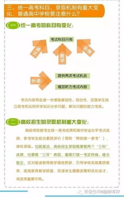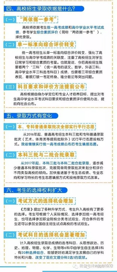 按照《方案》要求,我省從2018年秋季入學(xué)的普通高中一年級學(xué)生開始啟動高考綜合改革,考生總成績由統(tǒng)一高考的語、數(shù)、外3科成績和高中學(xué)業(yè)水平3個選考科目成績組成。招生錄取實(shí)行基于統(tǒng)一高考成績和高中學(xué)業(yè)水平考試成績、參考學(xué)生綜合素質(zhì)評價擇優(yōu)錄取機(jī)制。