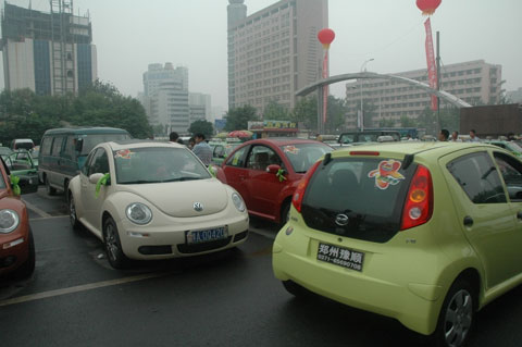 啟動(dòng)儀式現(xiàn)場(chǎng),愛(ài)心送考車(chē)輛整齊的貼上了愛(ài)心送考車(chē)貼,后視鏡上扎上了綠絲帶