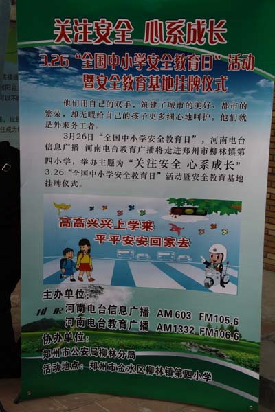 2012年3月26日是第十七個(gè)“全國(guó)中小學(xué)安全教育日”,在教育日當(dāng)天舉行“中小學(xué)安全教育基地”掛牌儀式,河南電臺(tái)信息廣播依托日常欄目《法制新河南》的整合資源,將中小學(xué)安全宣傳教育常態(tài)化。據(jù)河南電臺(tái)信息廣播總監(jiān)李金鋒介紹,“教育基地建立以后,河南電臺(tái)信息廣播將聯(lián)合鄭州市公安局柳林分局,通過信息廣播AM603、FM105.6廣播頻率,以《法制新河南》欄目為陣地,長(zhǎng)期持久的宣傳中小學(xué)安全教育知識(shí),并為柳林鎮(zhèn)第四小學(xué)的學(xué)生提供書籍、器械等安全教育的物品,節(jié)目主持人和柳林分局的警官還將不定期的深入校園內(nèi),跟學(xué)生們面對(duì)面的交流、一對(duì)一的輔導(dǎo)?!?/p>