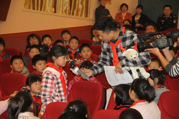 活動(dòng)現(xiàn)場(chǎng)信息廣播主持人張東為答對(duì)問(wèn)題的小學(xué)生派送禮物