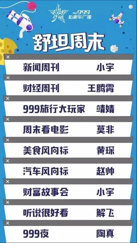 新聞周刊、財經(jīng)周刊、財富故事會、聽說很好看、美食風(fēng)向標(biāo)、汽車風(fēng)向標(biāo)……周末的生活,就得這么舒坦,就得這么輕松有料。短小趣味的節(jié)目,不同屬性的內(nèi)容,你要音樂,還是資訊,我們這里全部都有。