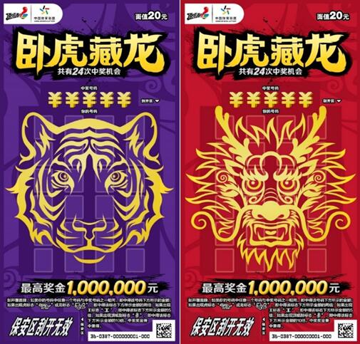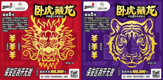 本次上市的“臥虎藏龍”主題即開套票,共有5元、10元、20元三種面值。票面設(shè)計(jì)色彩濃郁、霸氣美觀,“虎頭”、“龍頭”標(biāo)識(shí)躍然于票面正中,“眼神”犀利且極富“挑戰(zhàn)”意味,寓意充滿自信,敢于挑戰(zhàn)最高獎(jiǎng)金。