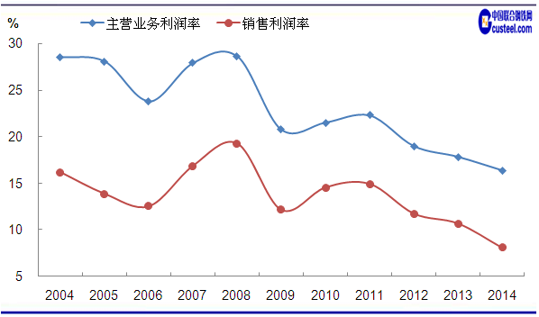 圖2 2004-2014年鐵礦采選業(yè)主營業(yè)務(wù)利潤率和銷售利潤率變化走勢 數(shù)據(jù)來源:中國統(tǒng)計局