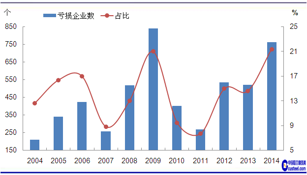 圖3 2004-2014年鐵礦采選業(yè)虧損企業(yè)數(shù)和占比變化走勢 數(shù)據(jù)來源:中國統(tǒng)計局
