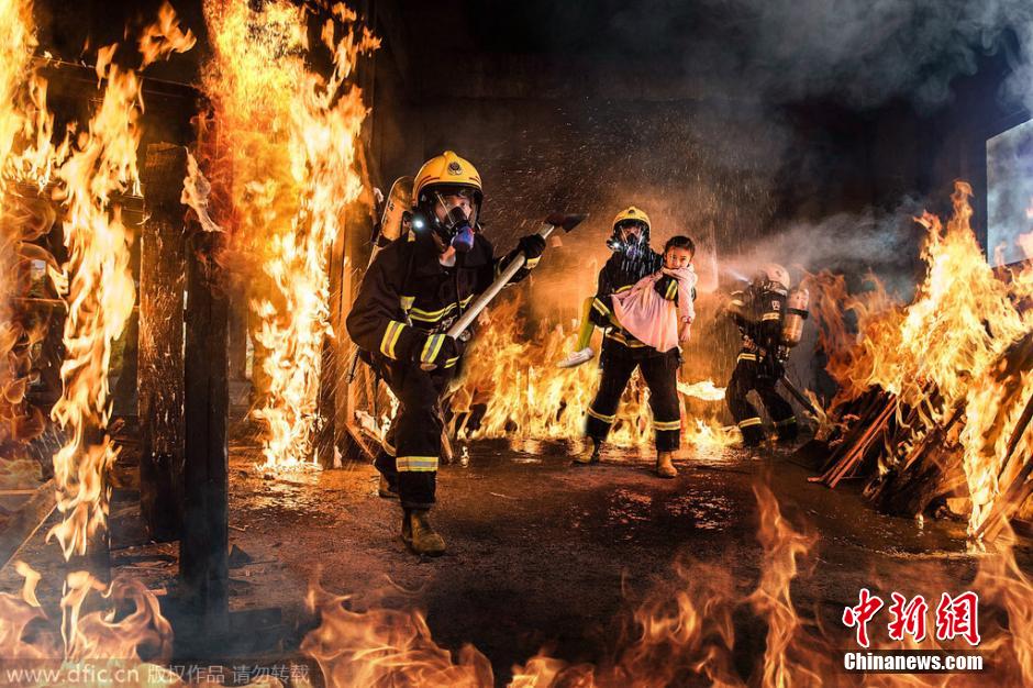 2014年11月6日,四川成都,“烈火中,他們展雄威,救人于危難,豪氣干云天”。當晚10時,11·9消防日即將到來,四川省消防總隊與成都商報聯(lián)合推出 “烈火雄心”系列海報式視覺大片,以情景再現(xiàn)的專業(yè)攝影手段,刻畫出消防官兵一個個真實的工作畫卷。整個系列海報由9幅照片組成,涵蓋了車禍救援、火場突圍、高樓救人等多個救援場景,海報中男消防員威武豪氣,女消防員英姿颯爽?!霸?19宣傳日,是想以一種更加直觀、形象的方式,還原消防員真實的生活工作狀態(tài)?!睋?jù)這組大片的主創(chuàng)人員介紹,這次的組圖拍攝,類型包括地震廢墟、車禍困人、高樓營救等各類場景,將更全面的向世人展示不同類型的消防員,以及他們在救援現(xiàn)場背后的感人瞬間,從各個層面展現(xiàn)出消防官兵他們奮不顧身、舍生忘死、一心為民的英雄本色。本組圖片中的角色,都是實實在在的消防員。每張海報的背后,都有著類似的救援故事,讓這些看似熟悉的場景,用海報大片的形式呈現(xiàn)給大家,將事實再現(xiàn)。圖片署名:成都商報-東方IC