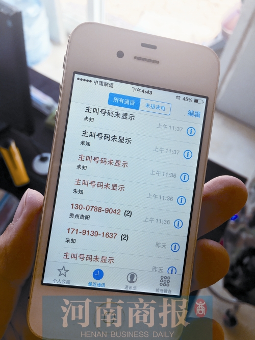 記者從夏先生的通話記錄上看到,除了主叫號碼未顯示、歸屬地未知的來電外,其余的來電來自廣東、安徽、貴陽等全國各地,且每個號碼也都不一樣。
