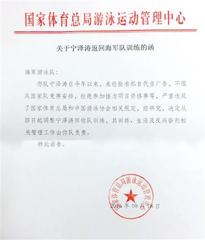 日前有媒體報(bào)道寧澤濤離隊(duì)的消息,并附有國(guó)家體育總局游泳運(yùn)動(dòng)管理中心內(nèi)部文件的照片,文件內(nèi)容為:“海軍游泳隊(duì):你隊(duì)寧澤濤今年以來,未經(jīng)批準(zhǔn)私自代言廣告,不服從國(guó)家隊(duì)競(jìng)賽安排,拒絕參加接力項(xiàng)目資格賽,嚴(yán)重違反了國(guó)家體育總局和中國(guó)游泳協(xié)會(huì)相關(guān)規(guī)定,經(jīng)研究,決定從即日起調(diào)整寧澤濤回你隊(duì)訓(xùn)練,其訓(xùn)練、生活及反興奮劑相關(guān)管理工作由你隊(duì)負(fù)責(zé)。特此函告。”時(shí)間落款為2016年10月18日。