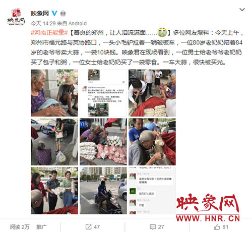 映象網(wǎng)快訊(記者 王寬 趙輝 實(shí)習(xí)生 張璨榮 文/圖)“我能想到最浪漫的事,就是和你一起慢慢變老……”8月23日中午,鄭州街頭上演暖心一幕,年過八旬的中牟老農(nóng)趕著毛驢車?yán)习檫M(jìn)城賣大蒜,一車蒜被搶購(gòu)一空,卻裝滿了鄭州愛心市民送的食物。