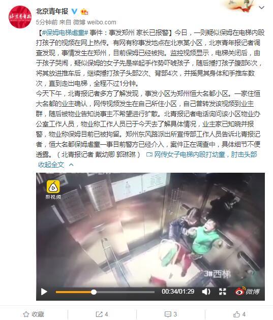 今日,一則疑似保姆在電梯內(nèi)毆打孩子的視頻在網(wǎng)上熱傳。有網(wǎng)有稱事發(fā)地點(diǎn)在北京某小區(qū),北京青年報記者調(diào)查發(fā)現(xiàn),事情發(fā)生在鄭州,目前保姆已經(jīng)被拘。監(jiān)控視頻顯示,電梯關(guān)閉后,由于孩子哭鬧,疑似保姆的女子先是舉起手作勢嚇唬孩子,隨后捶打孩子腹部6次,將其放進(jìn)推車后,繼續(xù)捶打孩子頭部2次、背部4次,并搖晃其身體和手推車數(shù)次,直到走出電梯,全程不過1分鐘。