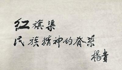 采訪結(jié)束時(shí),楊老不顧身體勞累,為“大河報(bào)紀(jì)念紅旗渠通水50周年特刊”題寫刊名:“紅旗渠民族精神的脊梁”。