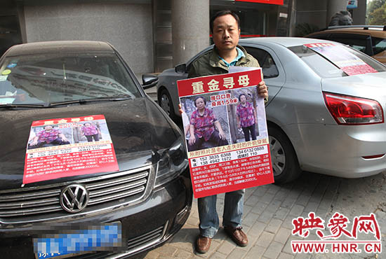 如果市民看到這樣一位老人,可以撥打映象網(wǎng)熱線電話0371-65887251與我們聯(lián)系,或是直接撥打司先生電話13461320888聯(lián)系。對于見到老人主動收留并與司先生聯(lián)系找到老人的,司先生及其家人將提供20000元現(xiàn)金作為酬謝。