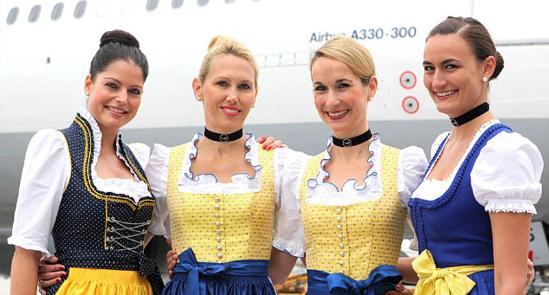 漢莎公司空姐2005年改穿這種巴伐利亞傳統(tǒng)制服,當(dāng)時(shí)恰逢每年一度的慕尼黑啤酒節(jié)。2014年,漢莎公司從慕尼黑前往北京、圣保羅以及墨西哥城的長(zhǎng)途航班上,乘務(wù)員都穿起傳統(tǒng)服裝。空姐穿黃色緊身衣,上面印有藍(lán)花,配上藍(lán)白相間的裙子。