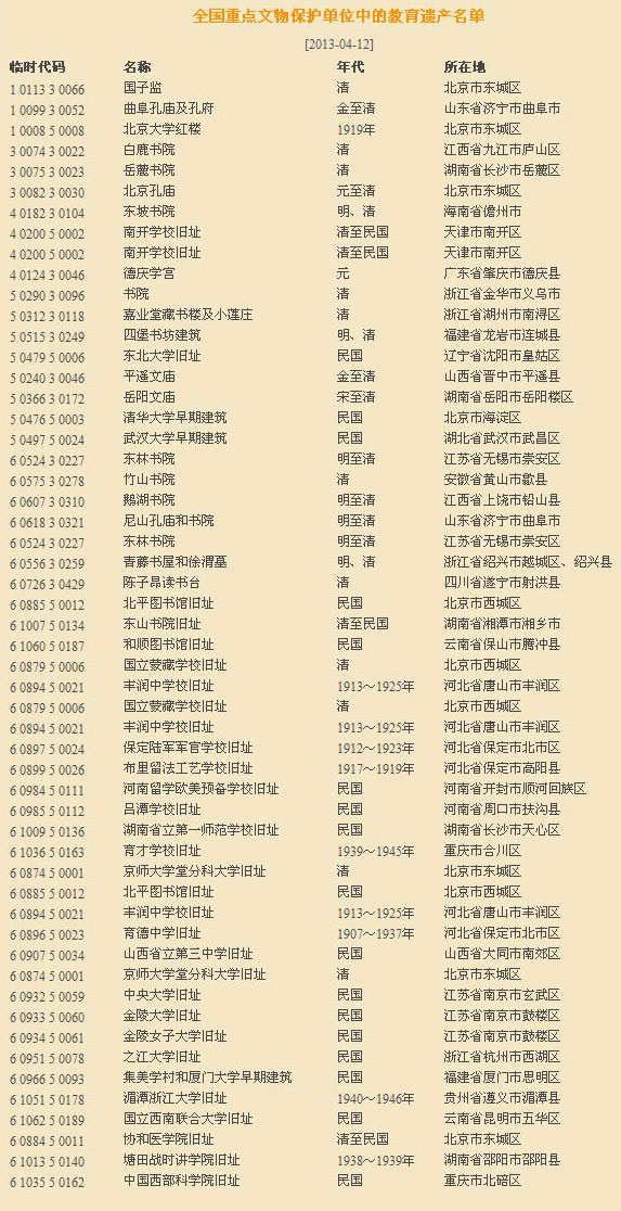 我國作為歷史悠久的文明古國,教育的傳統(tǒng)源遠(yuǎn)流長,春秋私學(xué)即興;此后官學(xué)、私學(xué)交織發(fā)展,在歷史上形成“學(xué)校如林、庠序盈門”的景象,給后世留下了極為豐富的教育遺產(chǎn)。僅在國務(wù)院批準(zhǔn)的全國重點(diǎn)文物保護(hù)單位當(dāng)中,就有 “國子監(jiān)”“孔廟”“白鹿書院”“岳麓書院”“北京大學(xué)紅樓”等相關(guān)教育遺產(chǎn)六十余處。它們不僅具有文物建筑本身的歷史、科學(xué)、美術(shù)、文化等各方面的價值,而且承載、見證了中華民族優(yōu)秀的文化教育傳統(tǒng),促進(jìn)了各個時代的精神文化建設(shè)。因此,提出并深入研究教育的遺產(chǎn),不僅有利于豐富歷史文化遺產(chǎn)的內(nèi)容,而且有利于進(jìn)一步細(xì)分文化遺產(chǎn)類型、豐富世界文化遺產(chǎn)的多樣性。