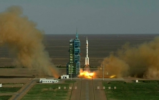 6月11日17時38分許,長征二號F遙十運載火箭在酒泉衛(wèi)星發(fā)射中心中國載人航天發(fā)射場順利點火起飛,將神舟十號載人飛船發(fā)射升空。電視截圖