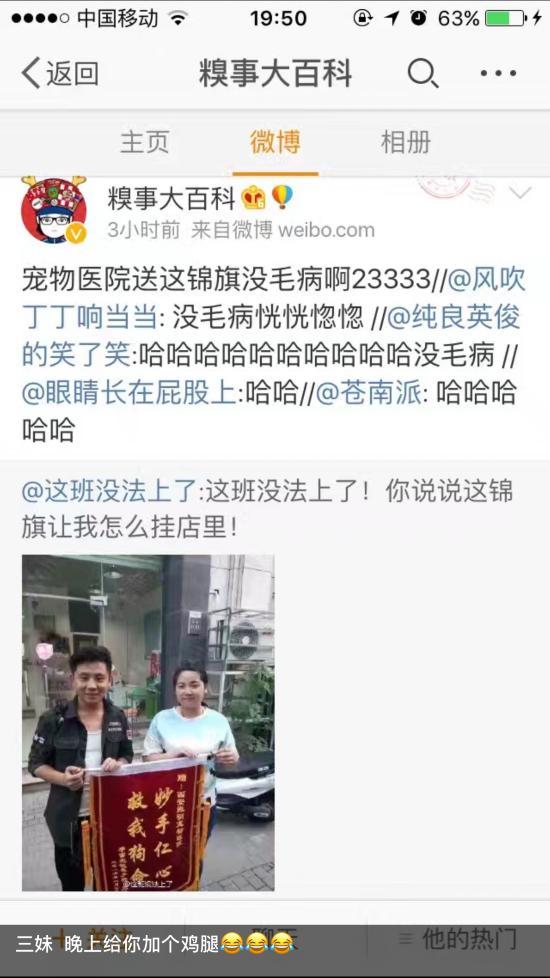 “狗狗三妹是今年4月份送到這里醫(yī)治的,8月7日送來(lái)了錦旗,和我們醫(yī)護(hù)人員合影。沒(méi)想到最近突然在微博火了,一覺(jué)醒來(lái),很多客戶叫我網(wǎng)紅。”振明寵物醫(yī)院院子孫振明說(shuō),有人贊揚(yáng)勇氣,有人嘲笑謾罵,但如果你要是知道事情的始末,你就不會(huì)覺(jué)得可笑?這是一個(gè)關(guān)于愛(ài)、守護(hù)和堅(jiān)持的故事。
