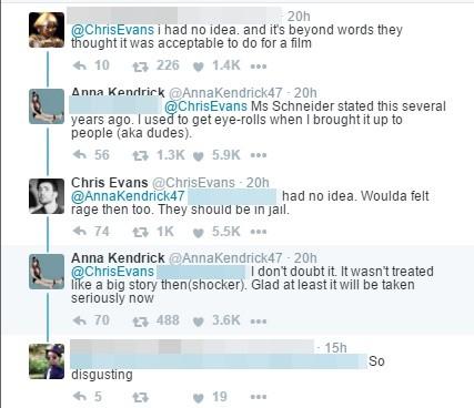 《美國(guó)隊(duì)長(zhǎng)》克里斯·埃文斯(Chris Evans)也表示:“天啊,我再也無(wú)法像過(guò)去那樣看待這部片子、貝托魯奇或白蘭度,這已經(jīng)超越了惡心,我覺(jué)得很憤怒!”他的發(fā)文也引來(lái)許多網(wǎng)友認(rèn)同,連《歌喉贊》女主角安娜·肯德里克(Anna Kendrick)也在底下回應(yīng)表示,“施耐德女士之前曾在訪談中說(shuō)過(guò),‘我曾提起過(guò)這件事情,聽(tīng)的人(男人們)還翻白眼’?!?/p>