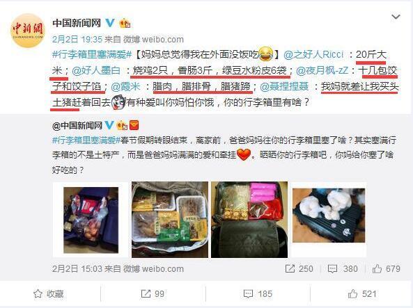 年,就這么過(guò)完了……@中國(guó)新聞網(wǎng)在微博上發(fā)起了一個(gè)過(guò)年返程催淚話題#行李箱里塞滿愛#,離家前,爸爸媽媽往你行李箱里都塞了啥?看了網(wǎng)友的回復(fù),有饅頭、大米、土雞蛋、餃子餡、燒雞……簡(jiǎn)直笑到飆淚。其實(shí),塞滿行李箱的不是土特產(chǎn)、不是洋氣貨,是愛、是滿滿的牽掛與不舍!