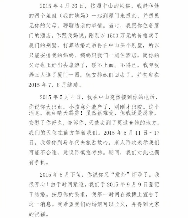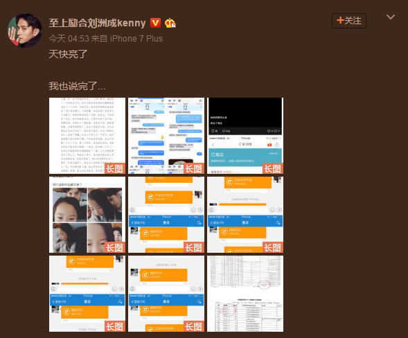 搜狐娛樂訊 5月23日凌晨,劉洲成發(fā)微博回應(yīng)家暴致前妻林苗流產(chǎn)及要求前妻出錢買房等傳聞。劉洲成在文中以時(shí)間為緯度講述他與前妻相識相愛到結(jié)婚的過程,還列舉出前妻從懷孕到流產(chǎn)的事例,劉洲成在文中還稱“從認(rèn)識你開始,就從沒花過你和你家一分錢”。此外,劉洲成更是曬出了昔日的聊天記錄、代付清單、借記卡賬戶歷史明細(xì)清單等證據(jù),疑似反駁前妻所述不實(shí)。