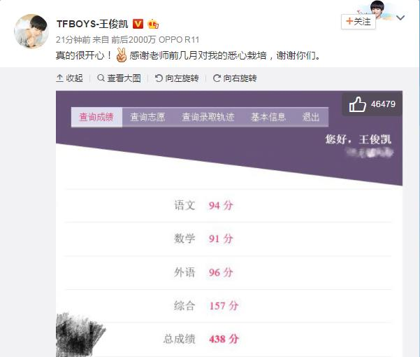 近幾日,2017年全國統(tǒng)一高考成績都陸續(xù)出爐,網(wǎng)友們非常關心的參加今年高考的TFboys王俊凱的成績今日也終于公布了!