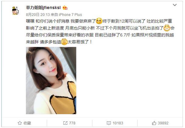 王思聰前女友雪梨懷孕:熬到12周孕吐明顯
