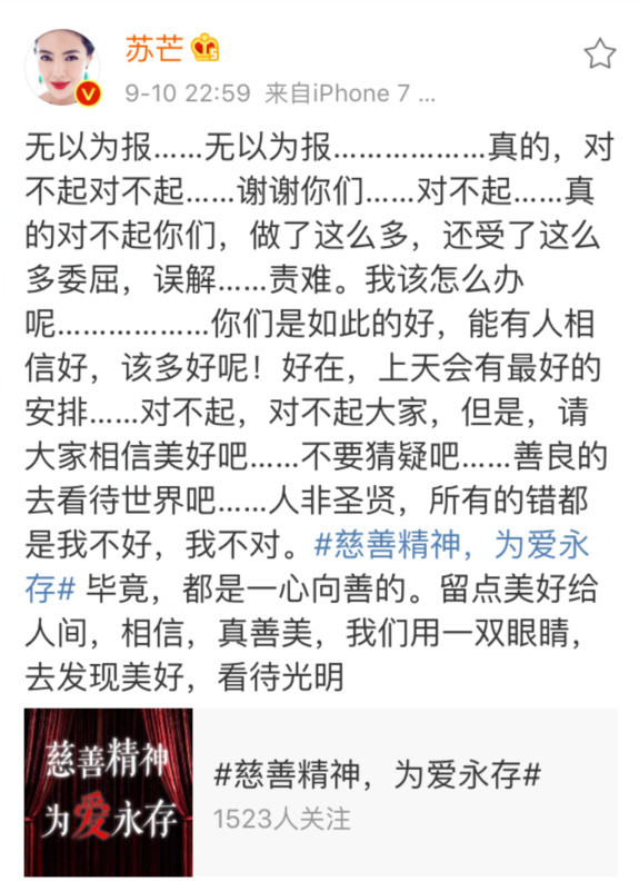 蘇芒微博全文:無以為報(bào),無以為報(bào)……真的,對不起對不起,謝謝你們,對不起,真的對不起你們,做了那么多,還受這么多委屈、誤解、責(zé)難。我該怎么辦呢……你們是如此的好,能有人相信好,該有多好呢!好在上天會(huì)有最好的安排……對不起,對不起大家。但是請大家相信美好吧……不要猜疑吧……善良的去看待世界吧……人非圣賢,所有的錯(cuò)都是我不好,我不對。畢竟,都是一心向善的。留點(diǎn)美好給人間,相信,真善美,我們用一雙眼睛,去發(fā)現(xiàn)美好,看待光明。