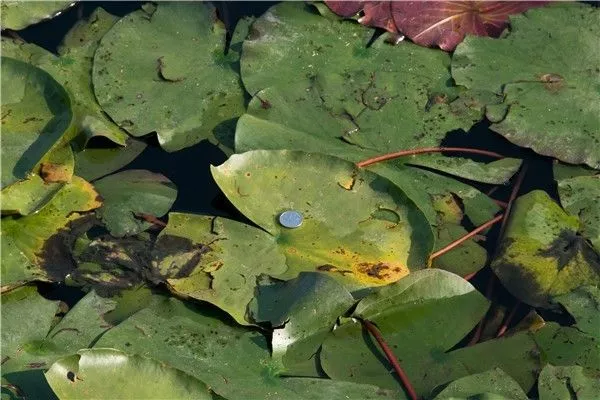 照著陳女士拍的照片,我很快在三潭印月附近找到這片睡蓮池,可并沒有在葉子上看到硬幣和紙幣,仔細找了一圈,終于找到了兩三枚。遠遠看去,像是一角錢面值的。經(jīng)過的游客大多流連于美景,駐足拍照留影,沒人往睡蓮葉上扔硬幣。