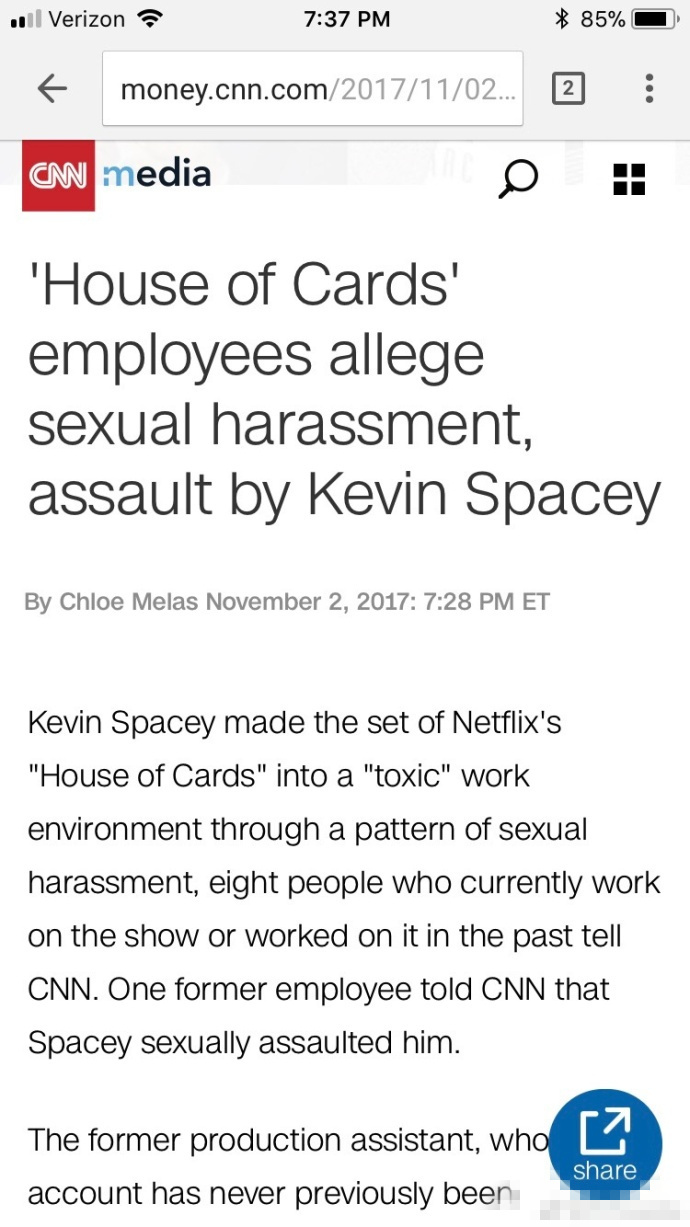 一位曾擔任過《紙牌屋》制片助理的員工稱,史派西在《紙牌屋》制作前幾季的時候性侵了他。這名員工說,有一天下午他被安排去開車接史派西來片場,結果在路上的時候史派西將手伸進了他的褲子里。“我當時整個人都驚了,”他說,“史派西在這部劇里的地位是非常高的,而我只是一個處于最底端的工作人員。”接下來在車里發(fā)生的事情,這名員工沒有細講。等他們到了片場之后,他幫史派西將行李從車上拿到了史派西的保姆車上,當時車上還有兩個男人,而史派西將他逼到角落不讓他走,然后對他做了一些不恰當?shù)慕佑|。“我告訴他了我不愿意做這些事,我感覺很不舒服?!比缓蟪弥放晌髅黠@有些慌張的時候逃離了拖車。