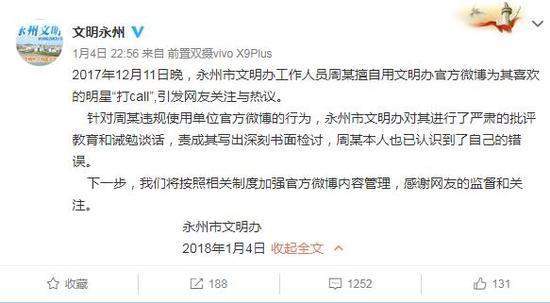 湖南省永州市文明辦官方微博:2017年12月11日晚,永州市文明辦工作人員周某擅自用文明辦官方微博為其喜歡的明星“打call”,引發(fā)網(wǎng)友關(guān)注與熱議。針對周某違規(guī)使用單位官方微博的行為,永州市文明辦對其進(jìn)行了嚴(yán)肅的批評教育和誡勉談話,責(zé)成其寫出深刻書面檢討,周某本人也已認(rèn)識(shí)到了自己的錯(cuò)誤。