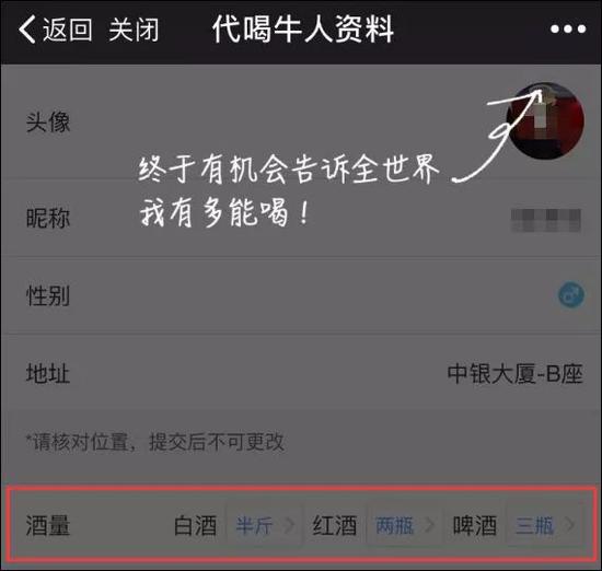 懷著對這項“神服務”的好奇,韓國記者還在中國特地體驗了一番。據(jù)《中央日報》報道,4日晚,韓國記者辦公室所在的北京市中心建國門一帶,記者嘗試使用了該軟件。建國門這附近還不算娛樂區(qū)域,但在半徑400米以內地圖上跳出10名代喝人的位置。記者在點擊其中一名代喝人后立即彈出他的自我介紹——“奧運會金牌級喝酒選手”,“酒量是白酒兩瓶、啤酒一箱”。