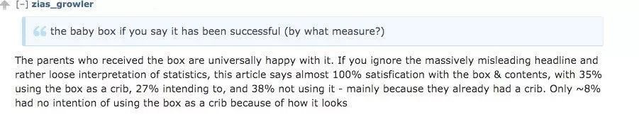 有網(wǎng)友說,“許多收到盒子的父母都很滿意,盒子里的東西可以給小寶寶用,而盒子本身還可以當(dāng)成一個嬰兒床?!?/p>