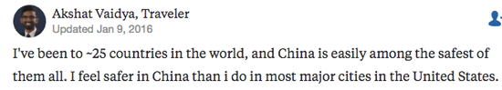 當然,在中國旅游對老外的吸引力不只是便捷。一位去過全世界二十多個國家的外國驢友總結說,“中國是我去過的最安全的國家之一。我感覺在中國的大型城市比在美國安全多了。”