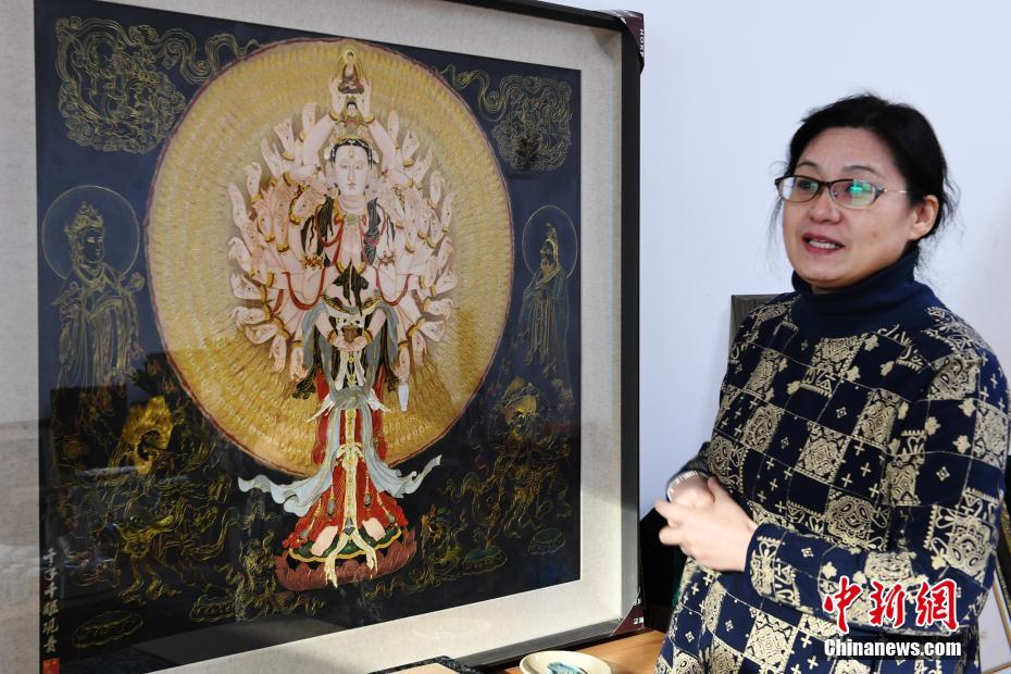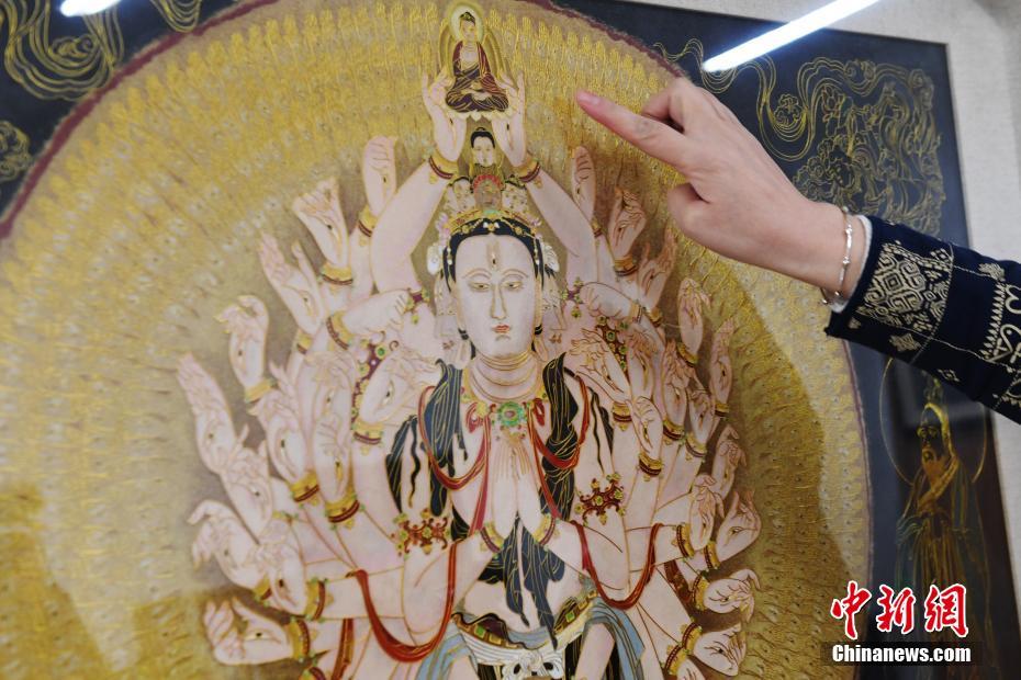 4月7日,蘭州文理學(xué)院女教師白茜介紹自己用萬根金屬絲創(chuàng)作出的“千手千眼觀音”掐絲琺瑯畫。從小喜歡繪畫的白茜通過自己十幾年的摸索,以敦煌壁畫為范本制作掐絲琺瑯畫。“千手千眼觀音”是白茜最滿意的作品,用了萬根一米左右的金屬絲臨摹完成。