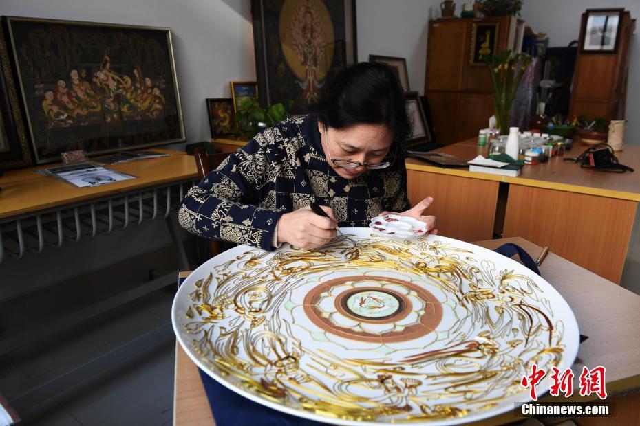 4月7日,蘭州文理學(xué)院女教師白茜用金屬絲在瓷盤上創(chuàng)作掐絲琺瑯畫。中新社記者 楊艷敏 攝