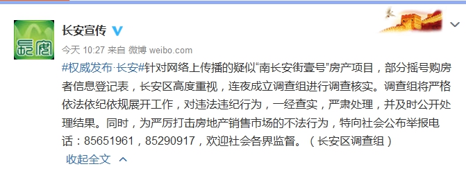 針對網(wǎng)友對“西安‘南長安街壹號’房產(chǎn)項(xiàng)目搖號購房實(shí)際早已被內(nèi)定”的質(zhì)疑,今日上午,陜西省西安市長安區(qū)委宣傳部在其官方微博表示,已成立調(diào)查組進(jìn)行調(diào)查核實(shí)。