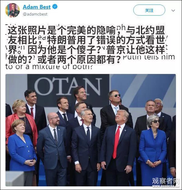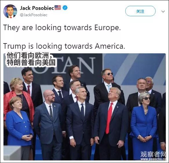 昨天,正在比利時(shí)布魯塞爾參加北約峰會(huì)的特朗普,又與“盟友”們留下了一張謎一樣的照片。就像此前在G7峰會(huì)上默克爾發(fā)的一張構(gòu)圖絕妙的照片,不同的視角會(huì)給人呈現(xiàn)完全不同的畫面,這張照片也一樣。