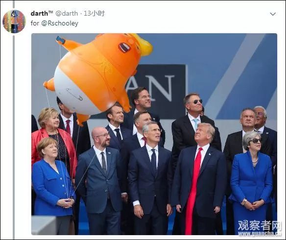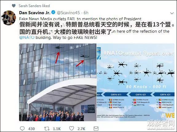 但是,白宮社群媒體主任史卡比諾 (Dan Scavino Jr。)卻站出來指責(zé)“假新聞”。他表示,當(dāng)時(shí)各國(guó)領(lǐng)導(dǎo)人正在抬頭看天空中飛過的13國(guó)直升機(jī),并配上了一張動(dòng)作整齊劃一的照片。