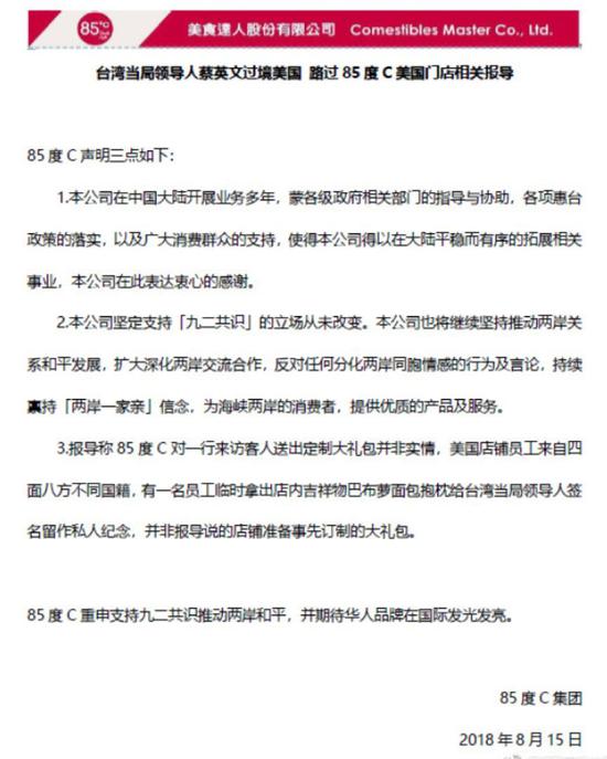 目前,針對蔡英文“訪問”其美國店面而引起了強(qiáng)烈輿論風(fēng)波,“85度C”剛剛在其開設(shè)在大陸微博和微信平臺(tái)的賬號上發(fā)布了一則聲明,強(qiáng)調(diào)其支持“九二共識”和“反對任何分化兩岸同胞情感的行為及言論”。
